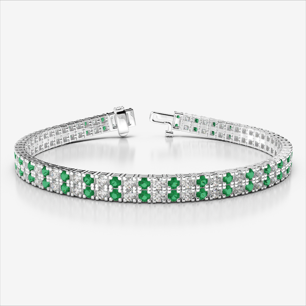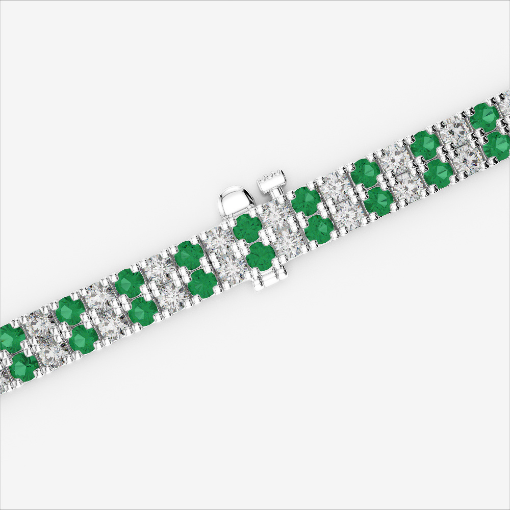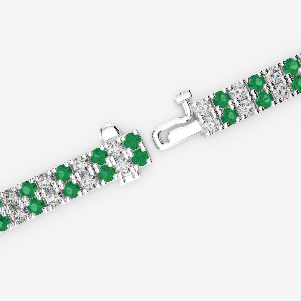 Crafted to the highest standards, this Double Row Prong Set Emerald and Diamond Bracelet showcases the harmonious blend of Emerald’s richness and Diamond’s sparkle. Prong-set round-cut stones ensure exceptional brilliance and sophistication. Perfect for formal events or commemorating milestones, it exemplifies timeless luxury.