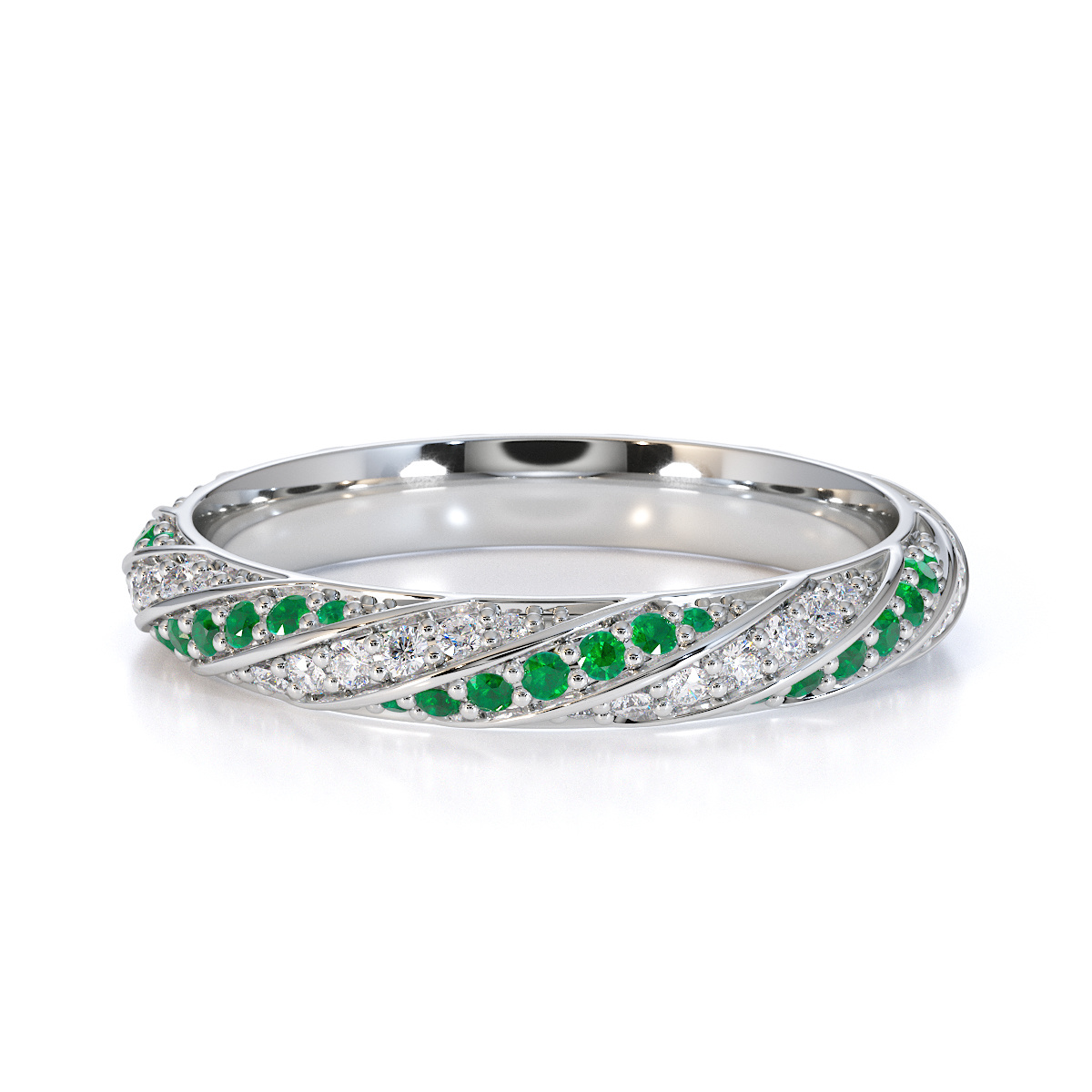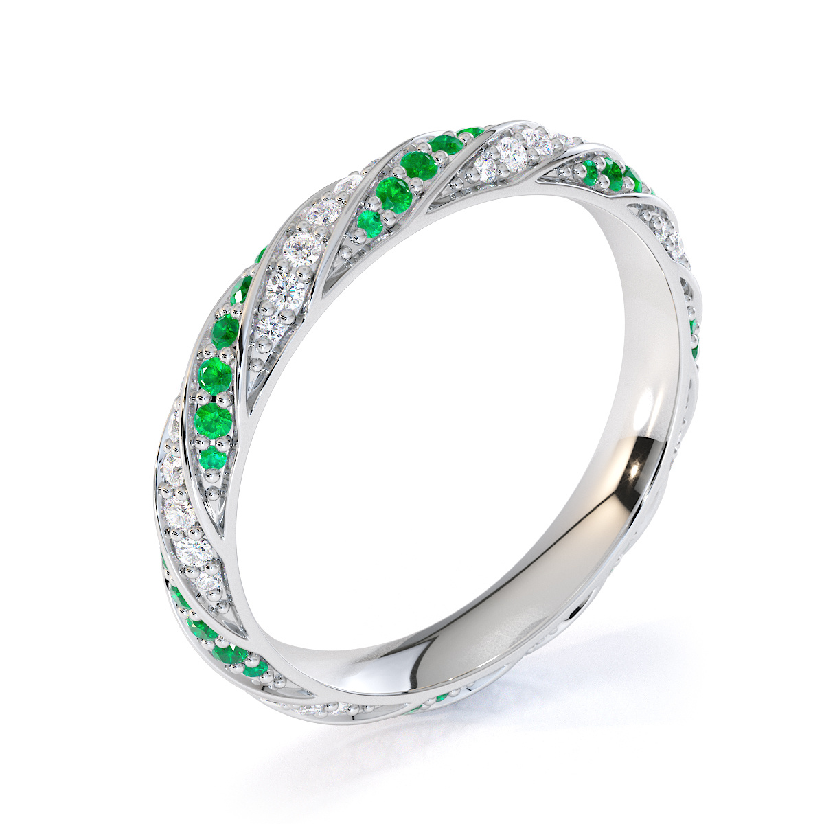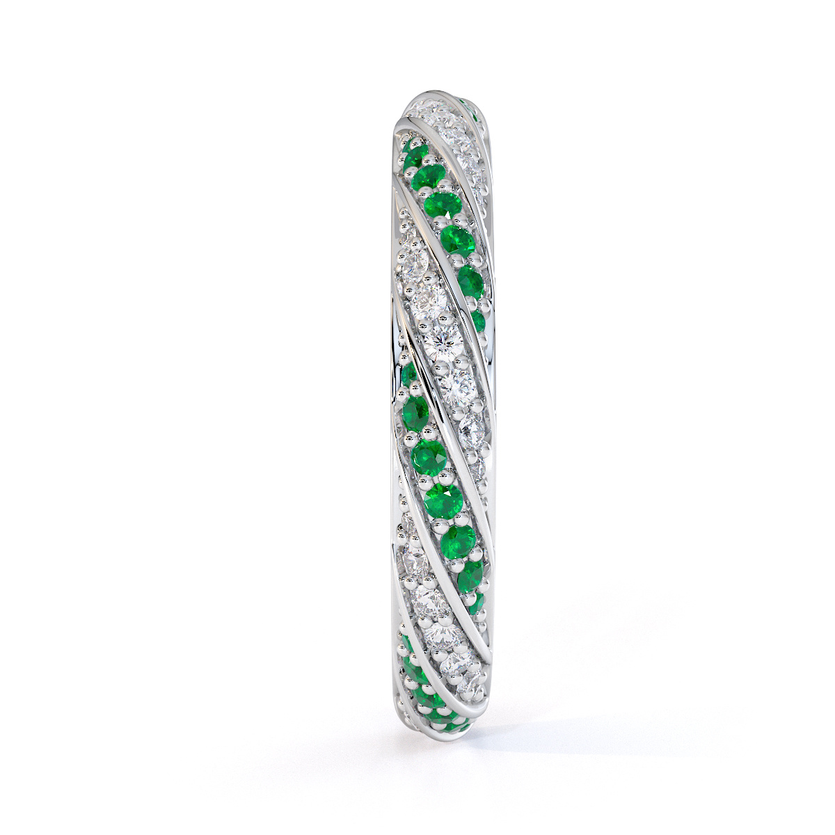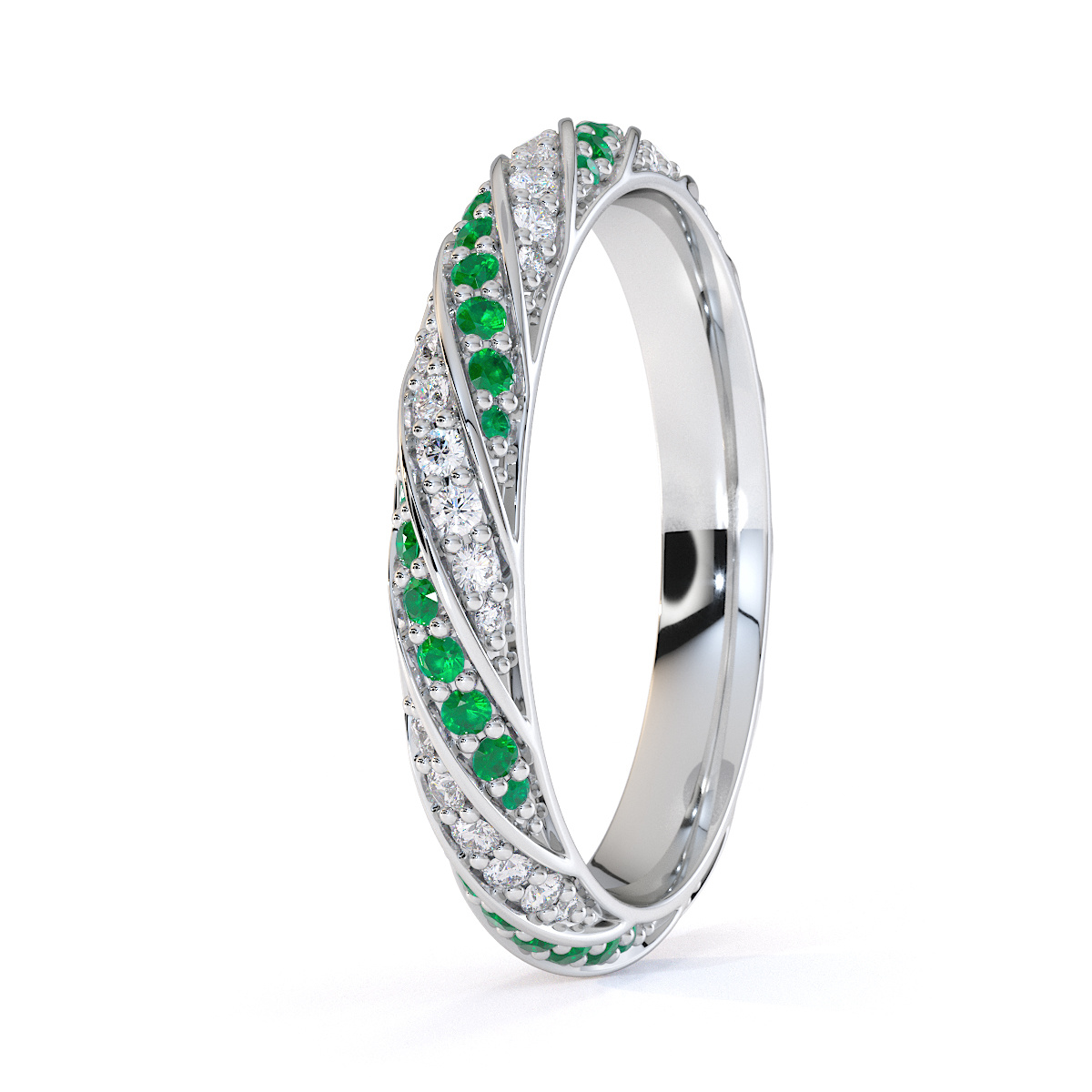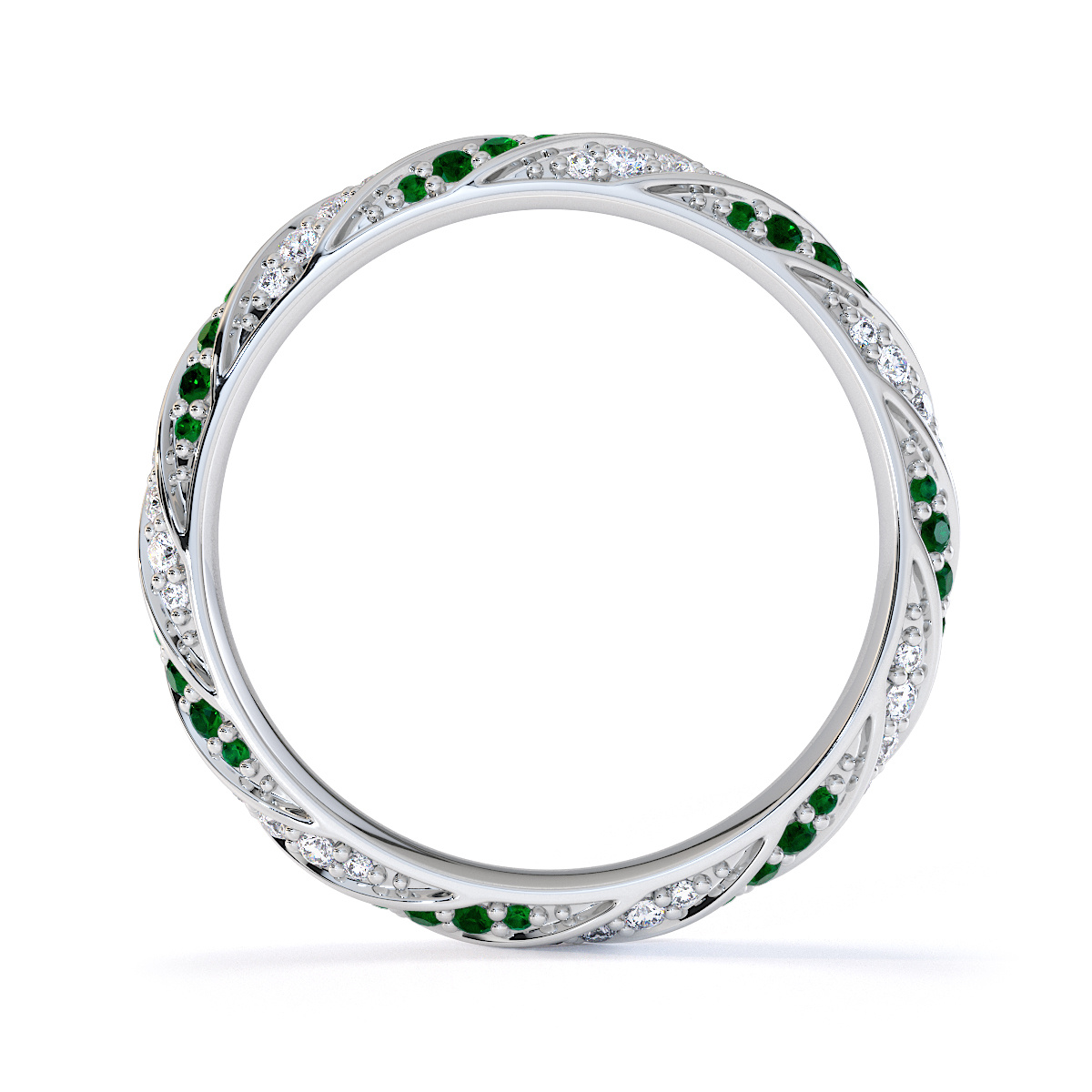 This eternity ring features timeless elegance with emeralds and diamonds, symbolising love and commitment. The full-eternity style, combined with a split prong setting, secures each stone while enhancing their brilliance. This elegant piece adds sophistication to any bride’s ensemble on her special day.