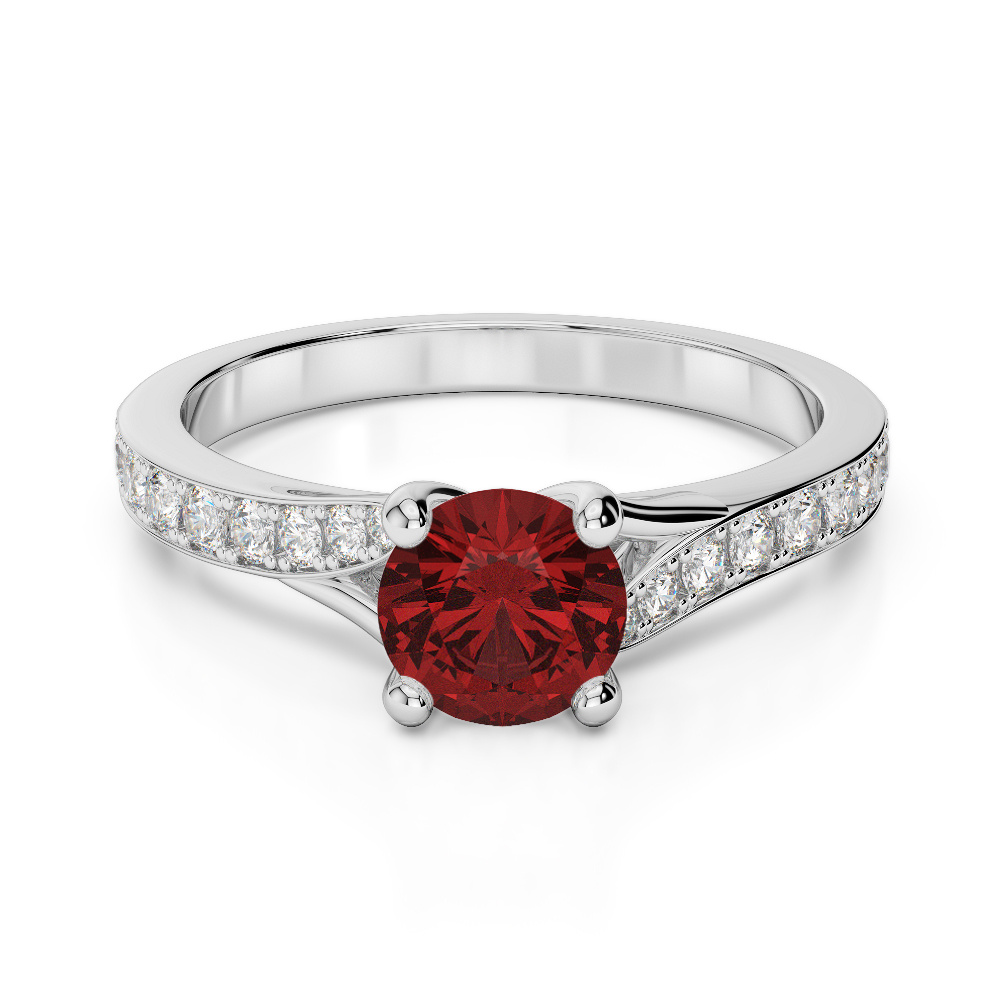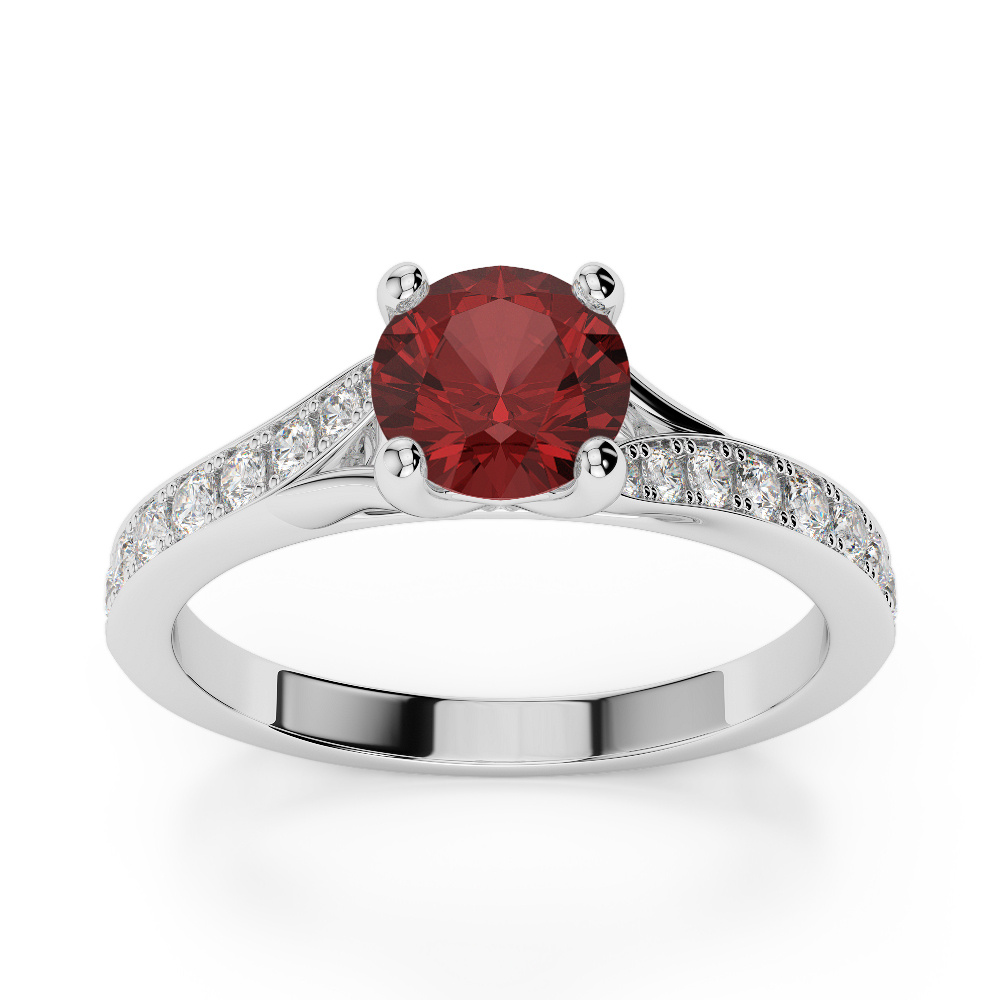 This exquisite Garnet And Diamond Engagement Ring features a stunning round brilliant cut diamond, expertly set in a classic prong setting to maximize its brilliance and sparkle. The prongs securely hold the diamond while allowing light to enter from all angles, enhancing its fire and scintillation. As the radiant centerpiece of this timeless design, the diamond beautifully symbolizes the eternal love and commitment shared between partners.