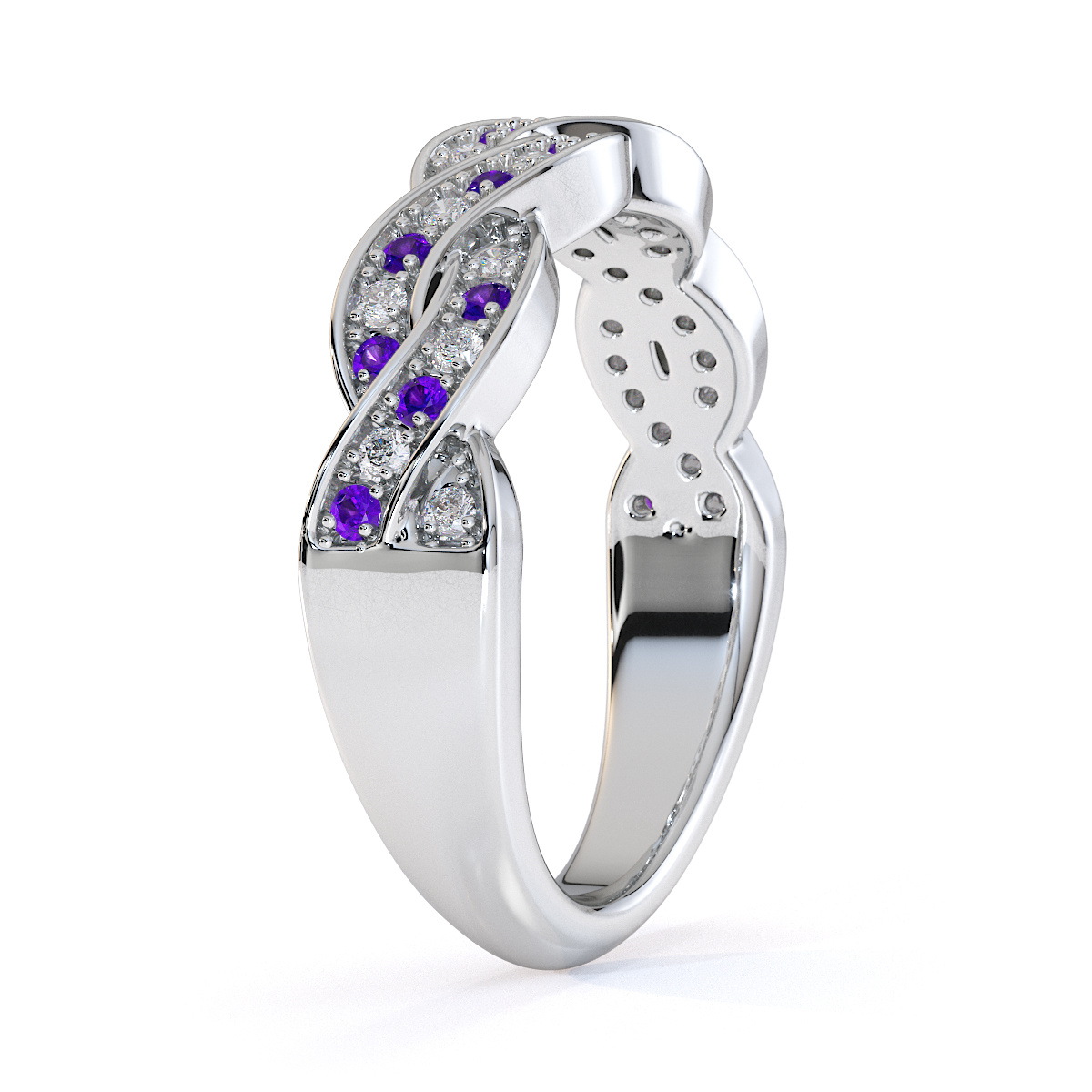 This exquisite half-eternity ring features a stunning combination of amethysts and diamonds. The prong setting enhances the brilliance of the gem, creating a luxurious and elegant piece of jewellery perfect for any special occasion.