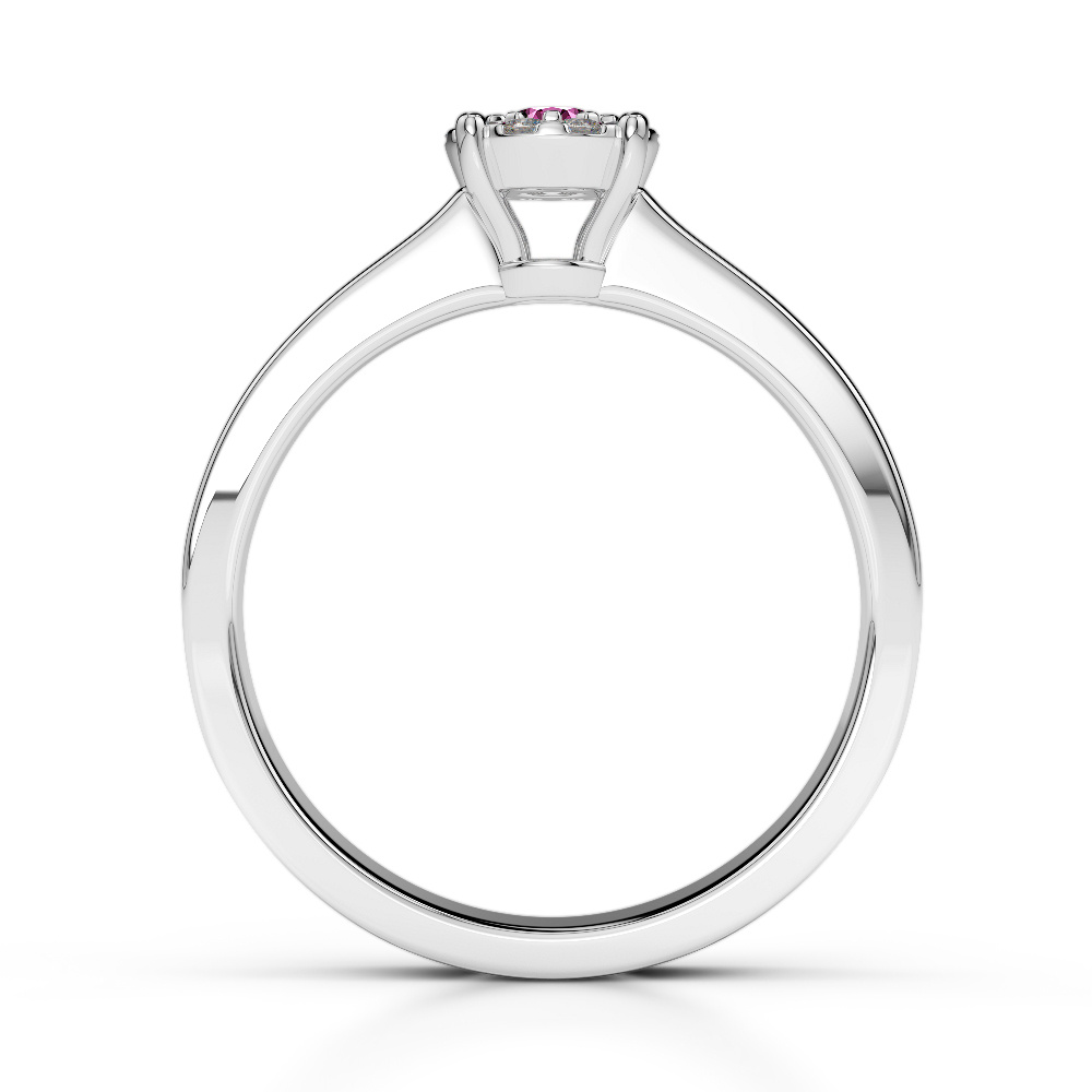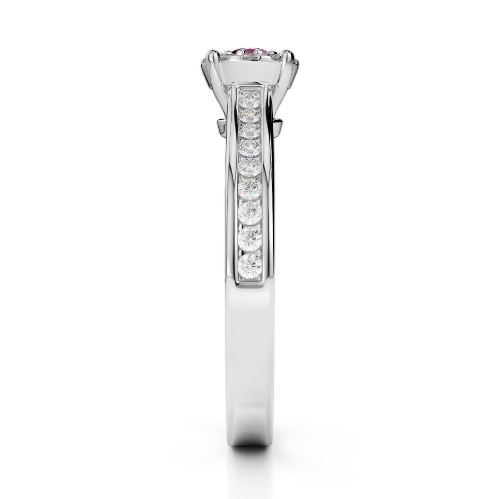 Elevate your love story with this exquisite Pink Sapphire And Diamond Engagement Ring, a true masterpiece that embodies elegance and sophistication. The stunning square cut diamond takes center stage, securely held in a classic prong setting that lifts the stone to maximize light exposure, enhancing its brilliance and fire. Surrounding this captivating centerpiece are meticulously set diamonds in a prong halo, adding depth and a dazzling frame of sparkle. Additional diamonds line the band in a sleek channel setting, offering a smooth, secure finish while creating a continuous flow of radiance. Together, the prong and channel settings blend classic craftsmanship with modern elegance, symbolizing the unique bond you share.