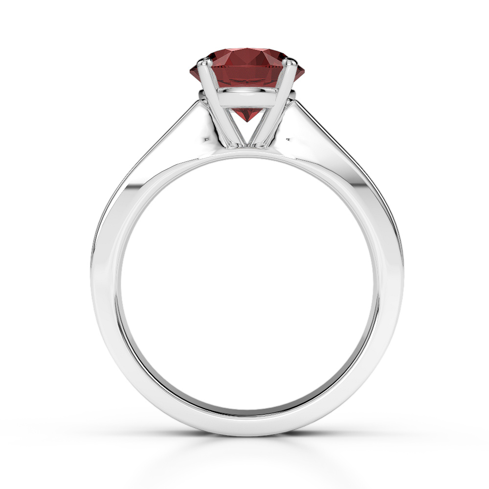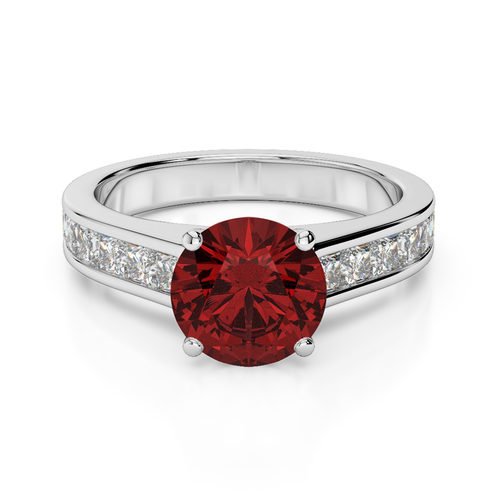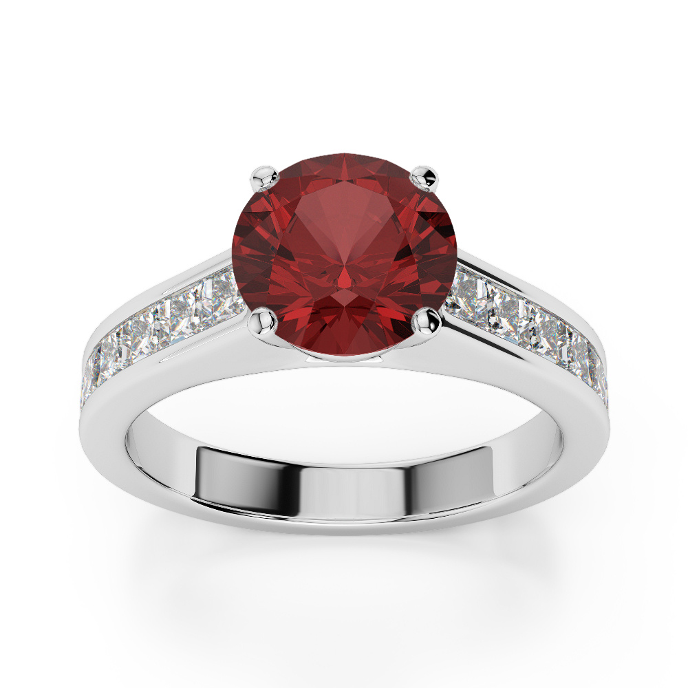 Elevate your love story with this exquisite engagement ring, featuring a captivating Garnet And Diamond Engagement Ring in a secure prong setting. Channel set accent diamonds line the sleek band, adding brilliance and elegance to this perfect blend of timeless beauty and modern style.